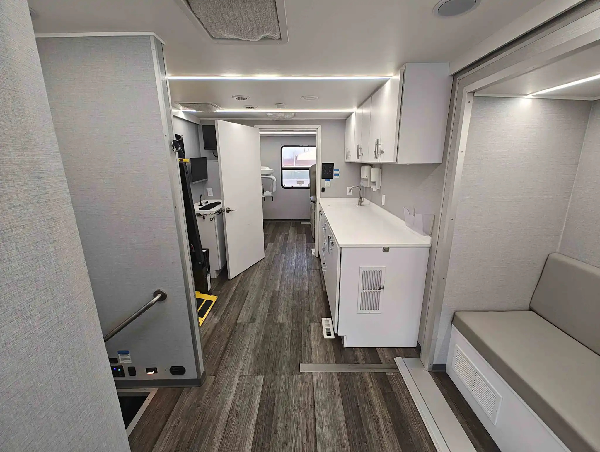 For sale is a 2014 3 Room Mobile Clinic With Audiology Booth on a Ford Motorhome chassis with 102,784 miles. This unit has been meticulously maintained and is in great condition! The vehicle has a LCI electronic leveling system, 7 Kw Cummins generator, and a 50-amp shore power. The front exam room is designed for streamlined diagnostics and includes a standing desk, Humphrey Field Analyzer, workstation, upper and lower cabinetry, a Magic Chef convenience refrigerator, and Dometic rooftop AC, along with an audio sound booth (Whisper Room) for precision hearing evaluations. The middle room enhances patient accessibility with a Braun wheelchair lift, comfortable bench seating, upper and lower locking cabinets, a heated sink, and a fully equipped patient triage station. The rear exam room includes a Brewer access exam bed, Dometic rooftop AC, and additional secure upper and lower cabinetry for clinical storage. The exterior of the unit has a power awning, exterior TV monitor, storage compartments, and a RVS camera system.
