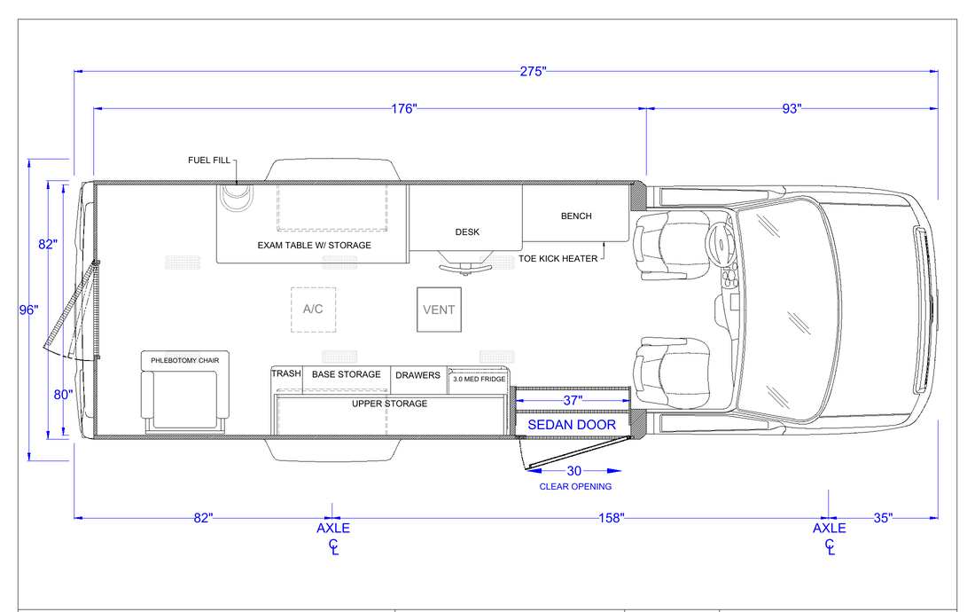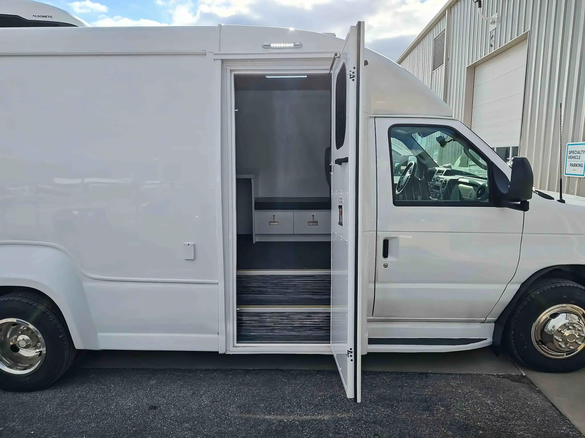 The Ford E-350 is a nimble and versatile single-room unit that maximizes operational efficiency with front and rear access points. It’s ideal for mobile service providers operating in challenging areas. Equipped with a standard one-room exam room, the unit’s true five-sided structure ensures industry-leading safety. The aerodynamic exterior design and comfortable interior make it stand out in the market.