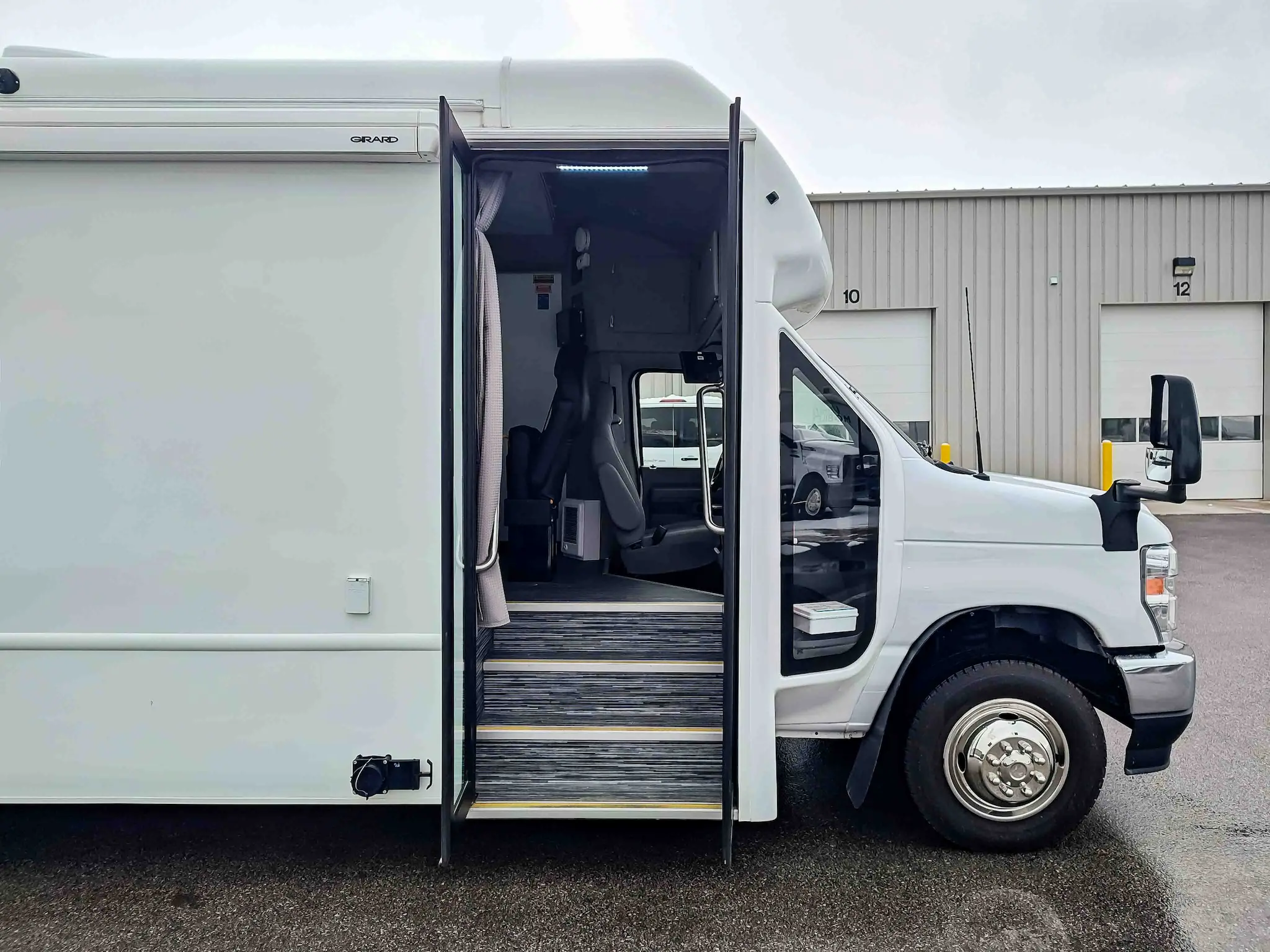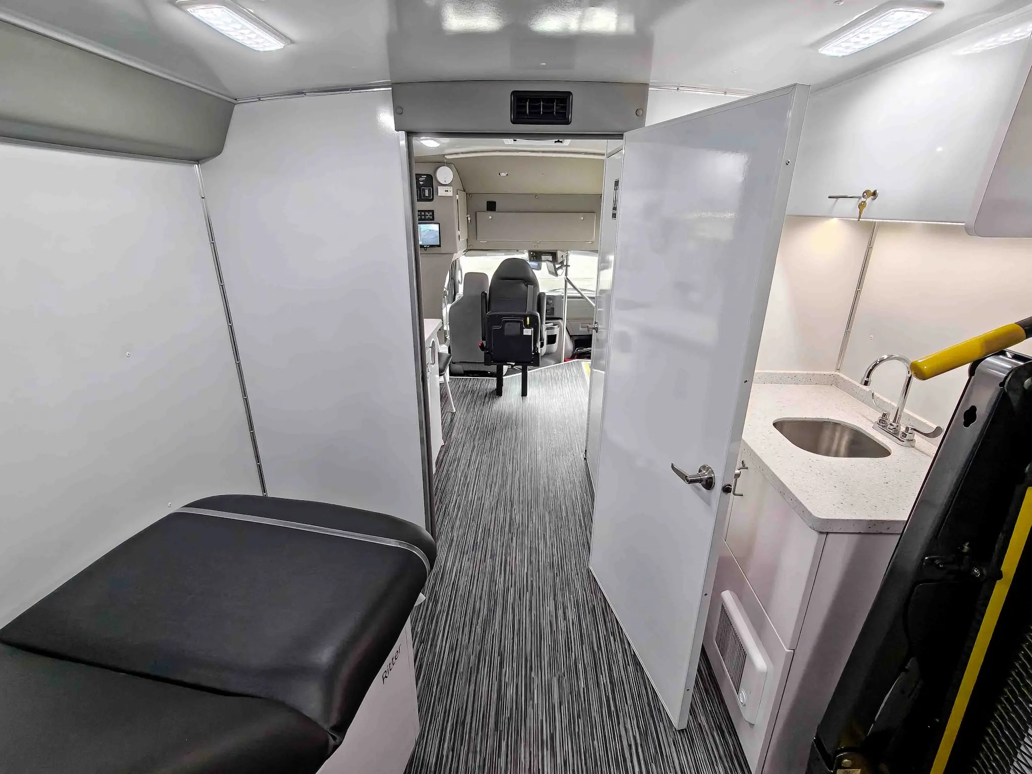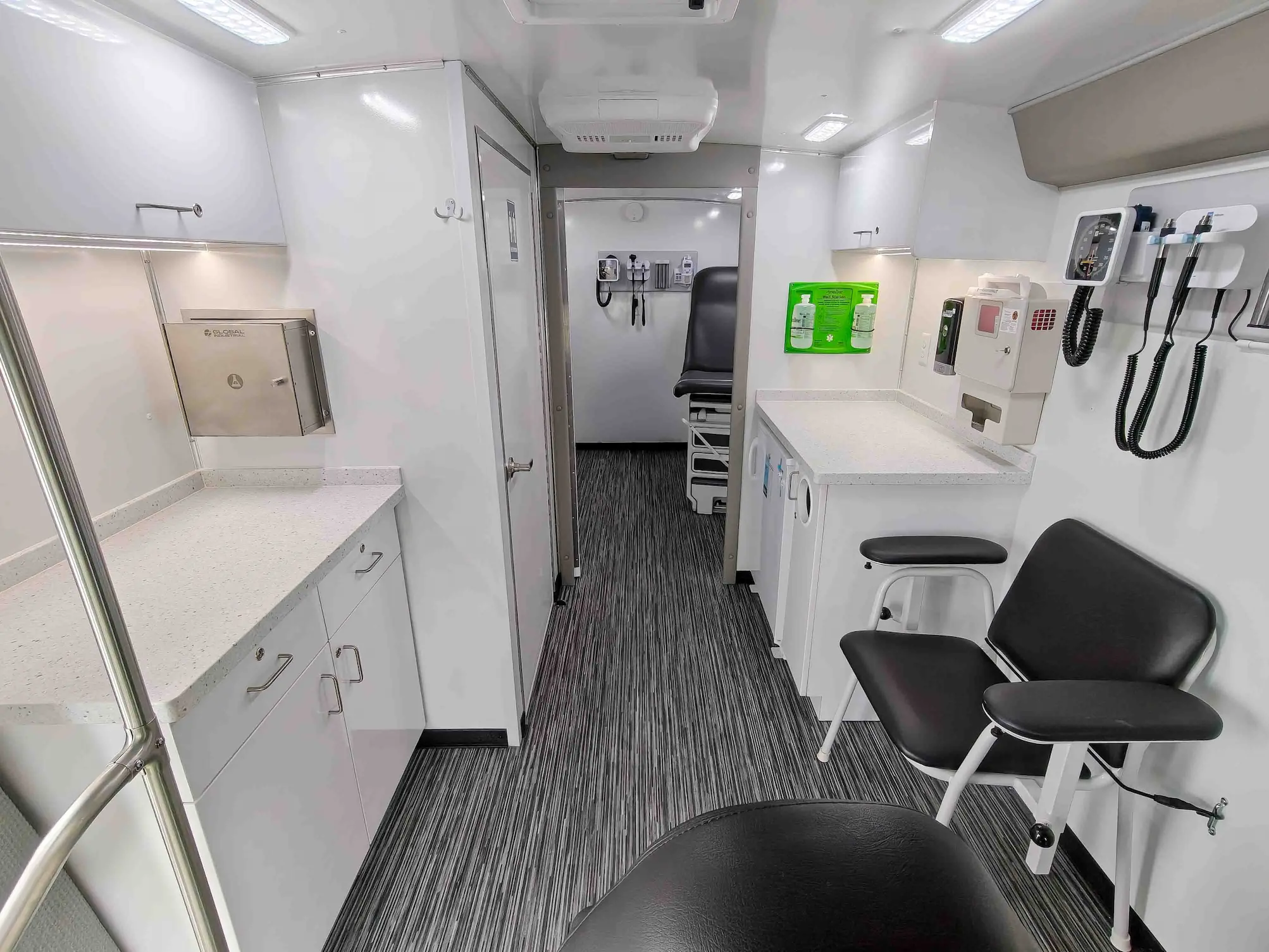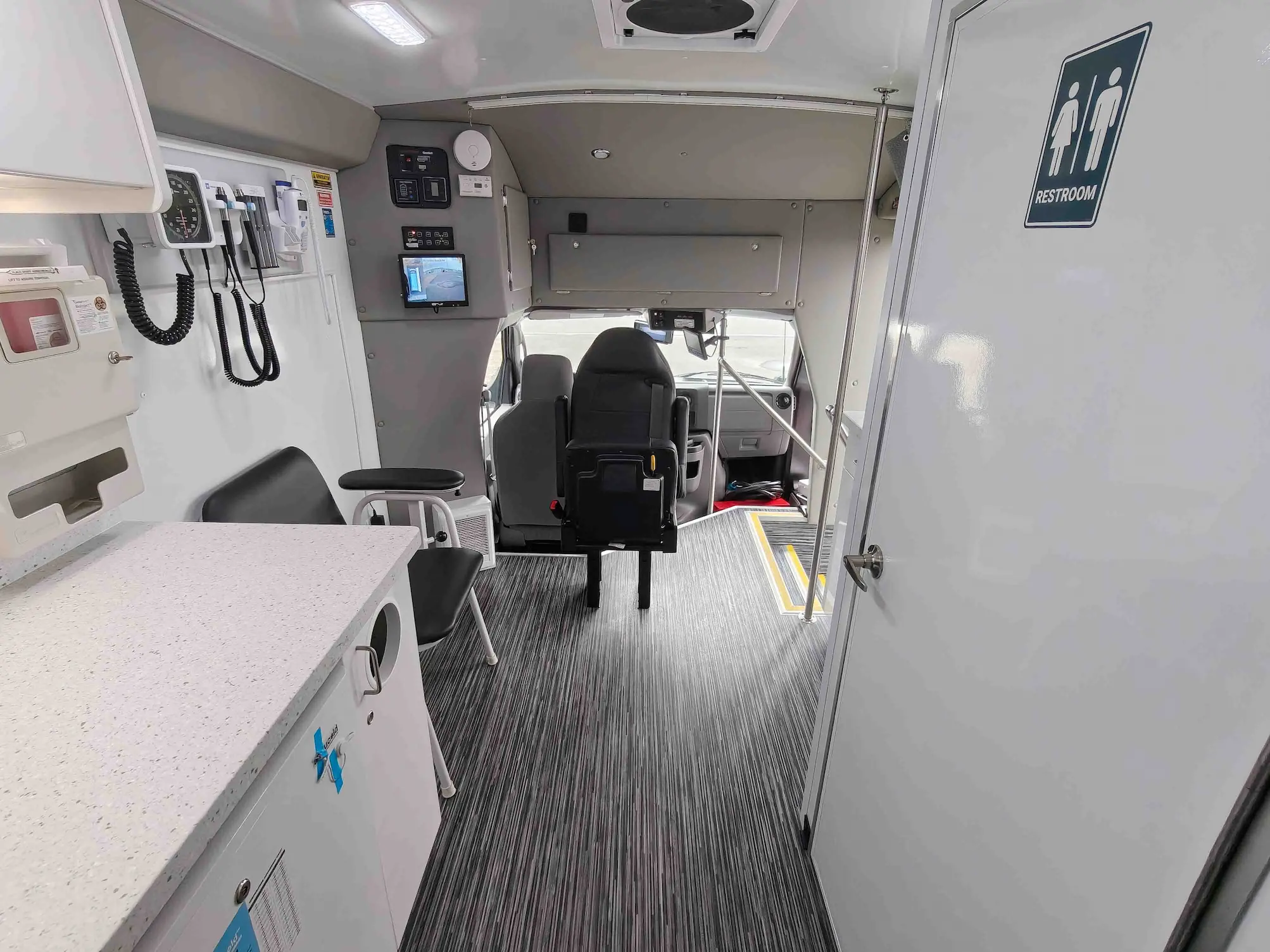 The new Ford E-450 is an economical mid-size unit with wheelchair access and two private rooms, maximizing operational throughput potential. It’s easy to drive and comes with standard features like an exam table, medical-grade fridge, bathroom, and custom cabinetry. The model includes a full roll cage for safety and has a sharp-looking straight wall exterior design. The Ford E-450 is a versatile and reliable option, ideal for programs that require both wheelchair access and flexible service options.