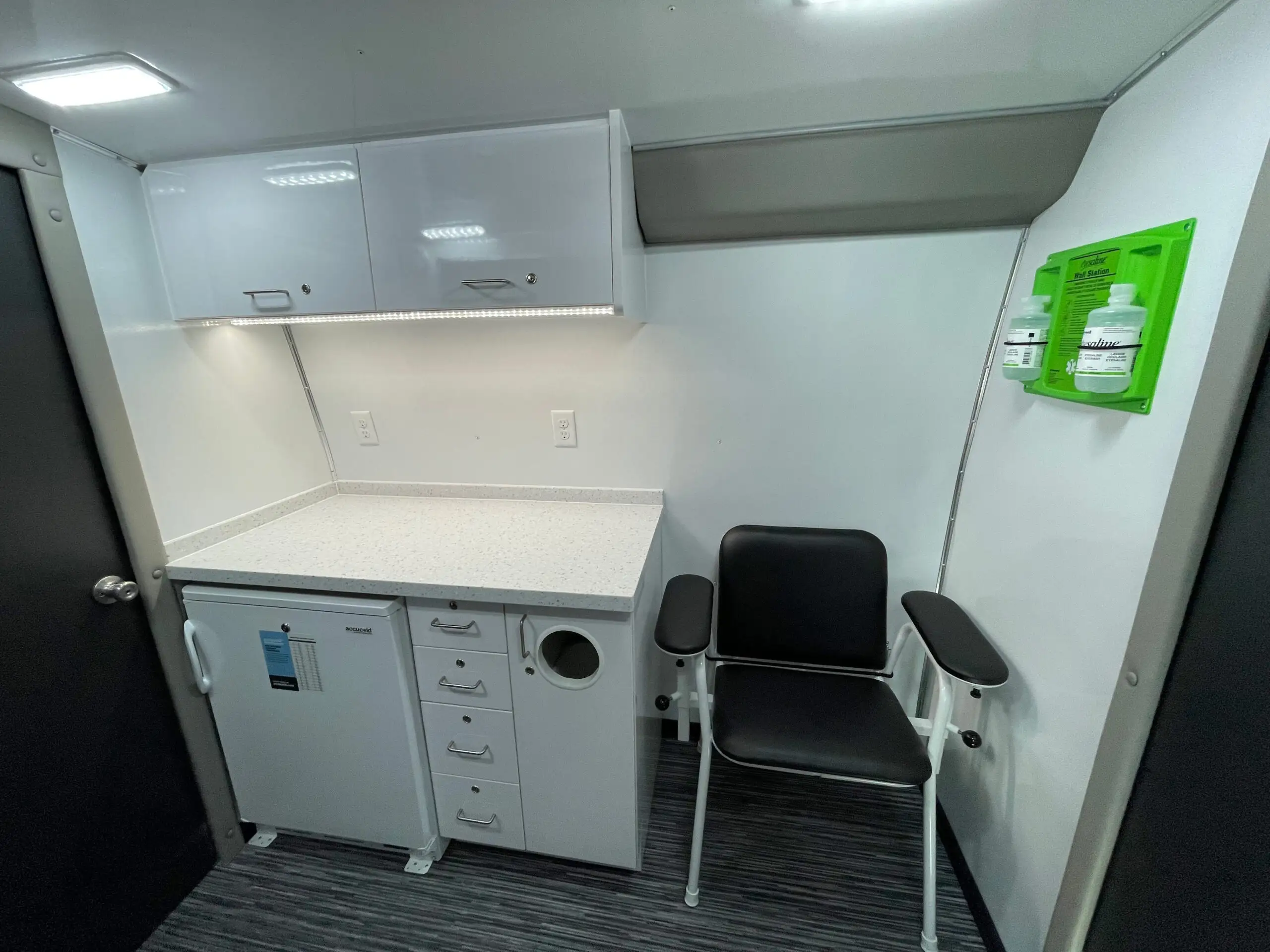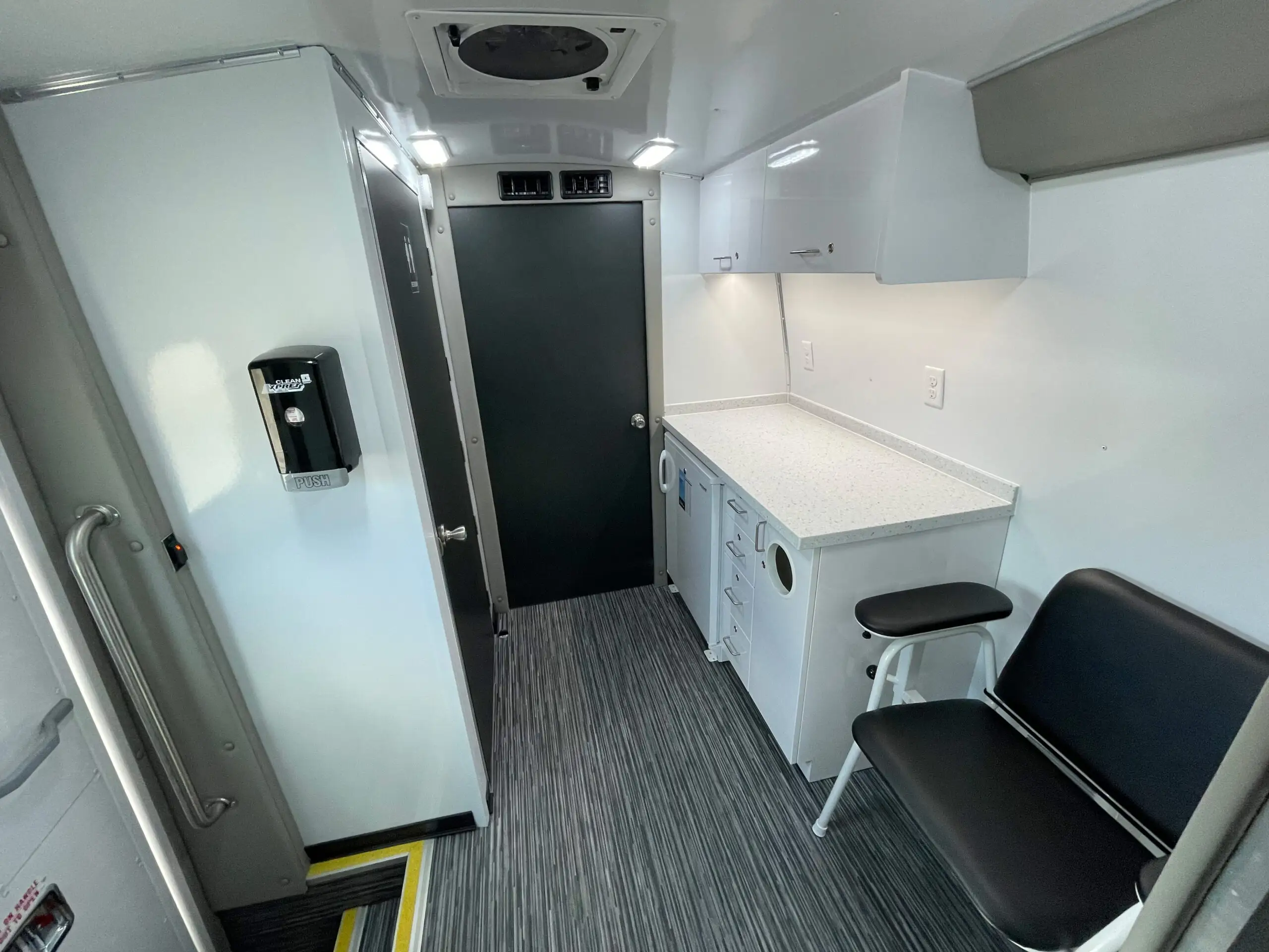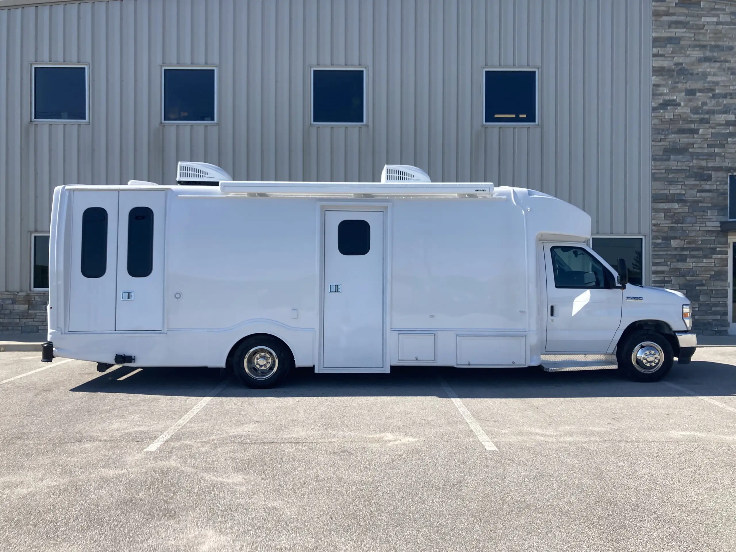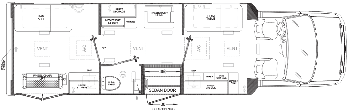 The new Ford E-450 at 30′ offers three separate spaces for services, including wheelchair accessibility, maximizing productivity. Its larger size provides a comfortable and spacious feel, yet remains nimble enough in limited parking areas. Standard features include an exam table, medical-grade fridge, and bathroom, with a true five-sided structure for safety. With its aerodynamic exterior and comfortable interior, the Ford E-450 is a reliable and efficient vehicle, ideal for programs requiring space, accessibility, functionality, and safety.