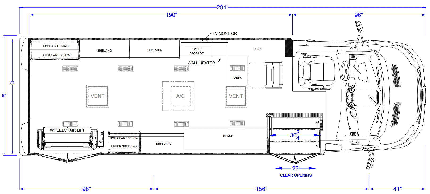 The new Ford Transit is a fully equipped mobile library unit with two separate entry points—a heavy-duty electric door for ambulatory access and a wheelchair-accessible entrance with an 800 lb commercial lift—for maximum accessibility and throughput. It features LED lighting, Acore shelving and book carts, a circulation desk, bench seating with storage, and climate control with roof AC. Standard amenities include a 4kw Onan generator, 50 amp shore power, multiple outlets, an eyewash station, bathroom facilities, and durable Altro faux wood flooring. The Ford Transit mobile library is a versatile, accessible, and reliable solution for bringing library services directly to communities.