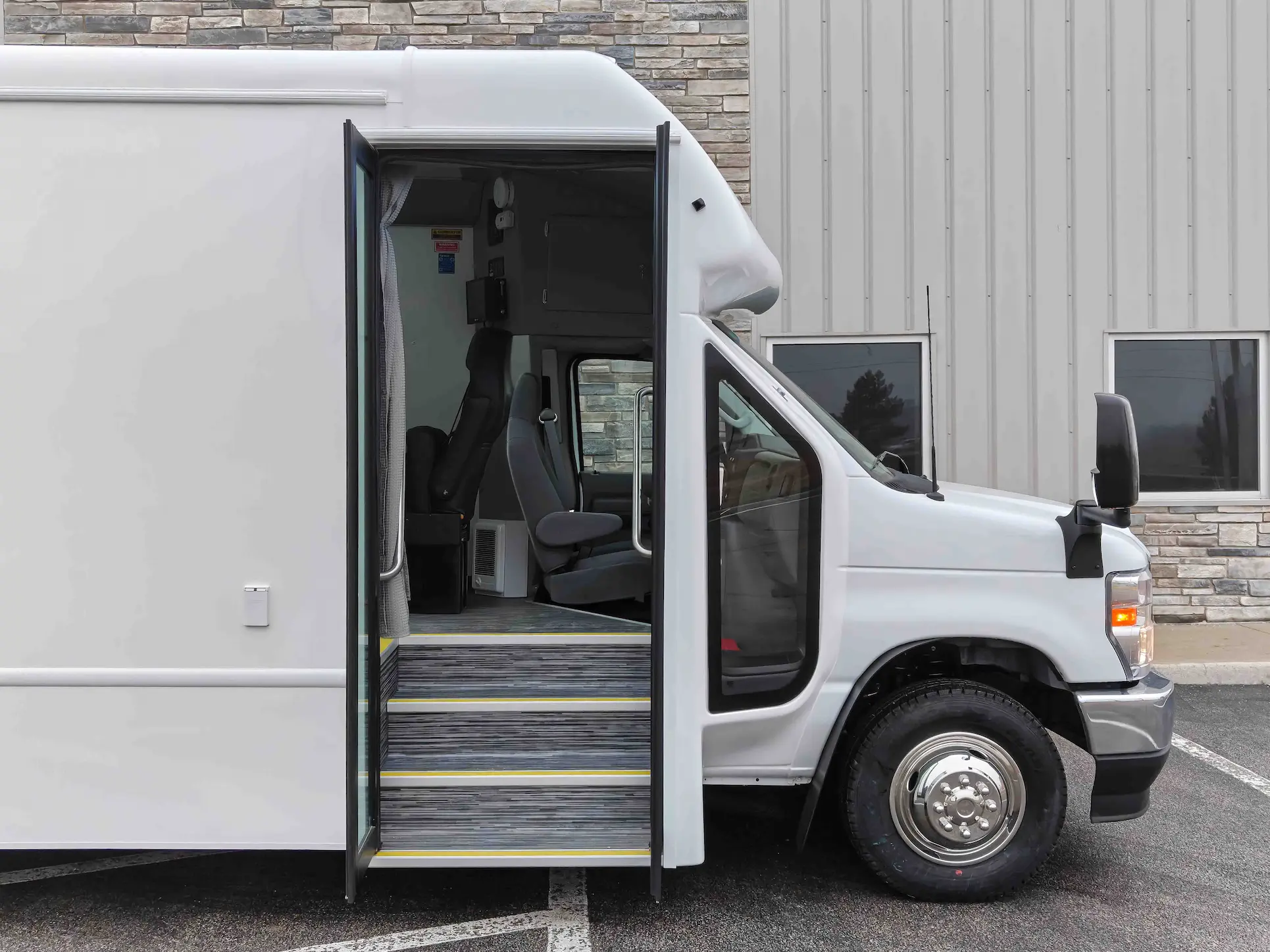 The new Ford E-450 is a versatile and unique mid-size vehicle with wheelchair access, maximizing operational throughput potential. Its rear room wheelchair lift and two additional access points offer flexible service options, ideal for challenging areas. Equipped with standard features like an exam table, medical-grade fridge, and bathroom, it’s easy to drive and has a full roll cage for safety. The Ford E-450’s sharp-looking exterior and comfortable interior make it stand out, providing accessibility, functionality, and safety for any customer application.
