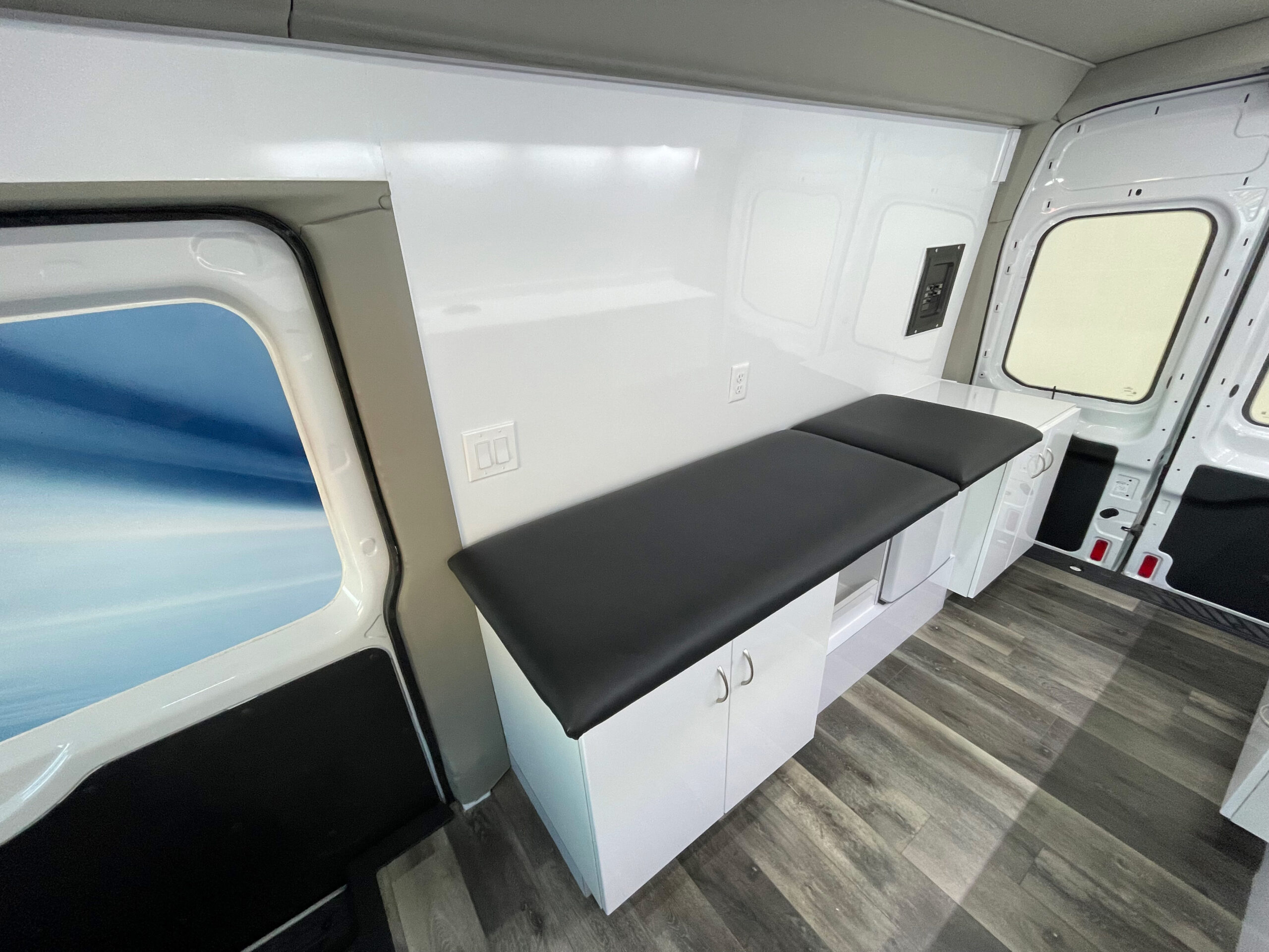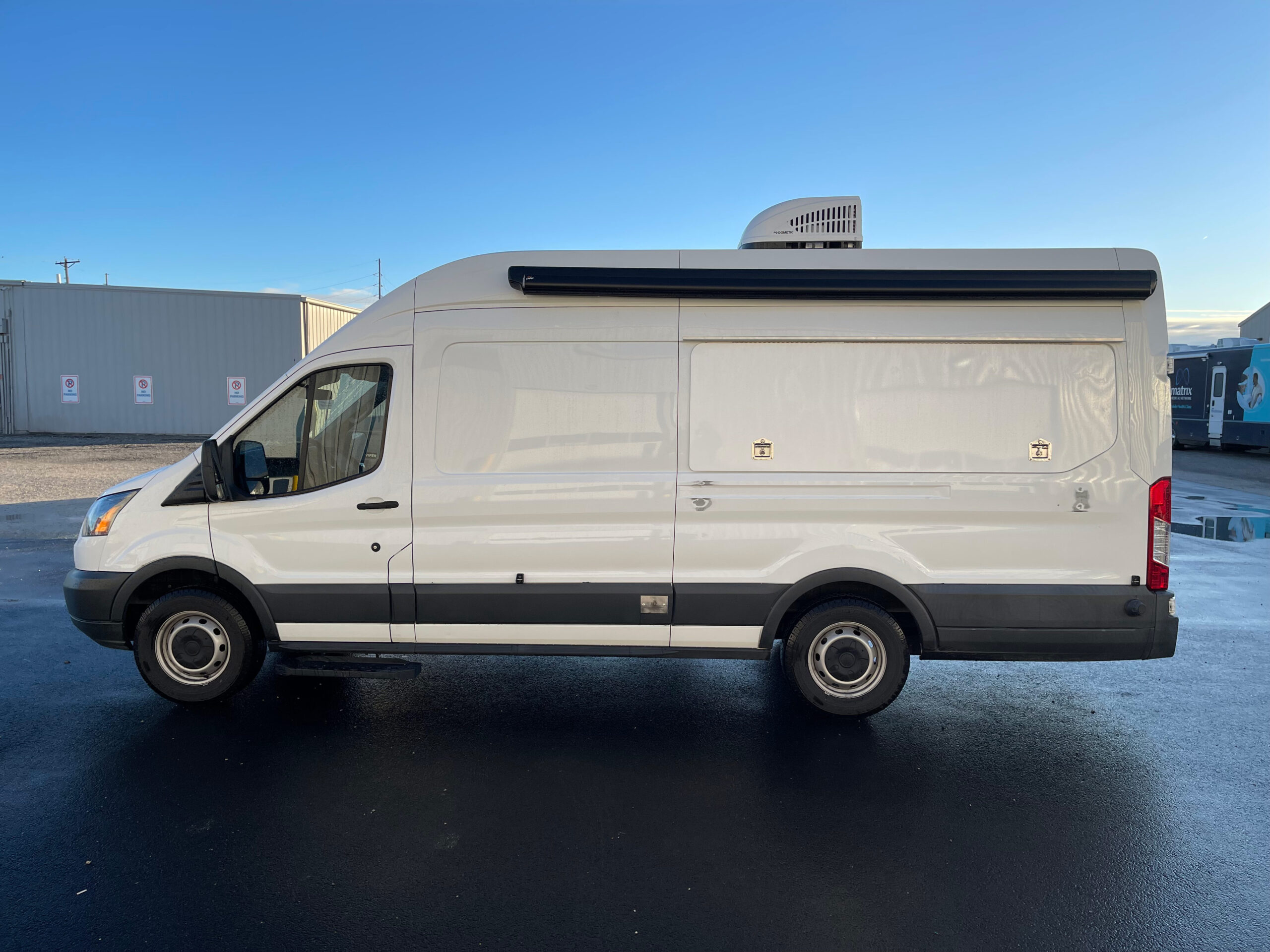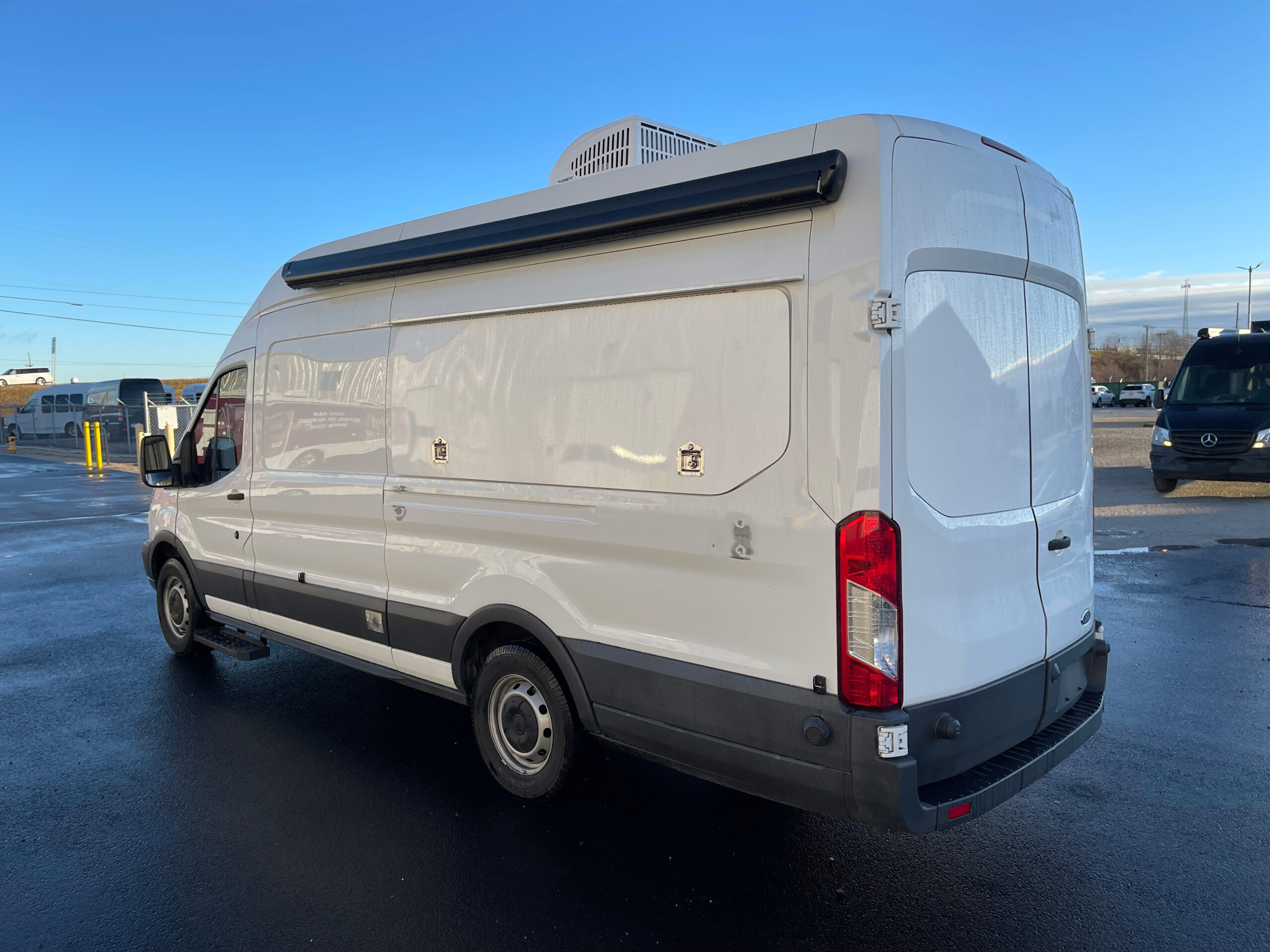 For sale is a 2017 Ford Transit Specialty unit with 70,726 miles. This unit has ideal floor space for 1 exam area, with the exam bed built into the wall for stability and the back incline adjustable for comfort, still allowing for great work flow. It comes equipped with passenger and driver side awning systems, newer flooring that’s in excellent shape, Black and Decker Fridge, power windows and locks, power steering, tilt steering, AM/FM/MP3 Stereo, manual entry door, entry grab handle, dash heat/AC, rear dome lights, vinyl seating, rear storage, exterior storage compartment on driver side, medical equipment, and much more.