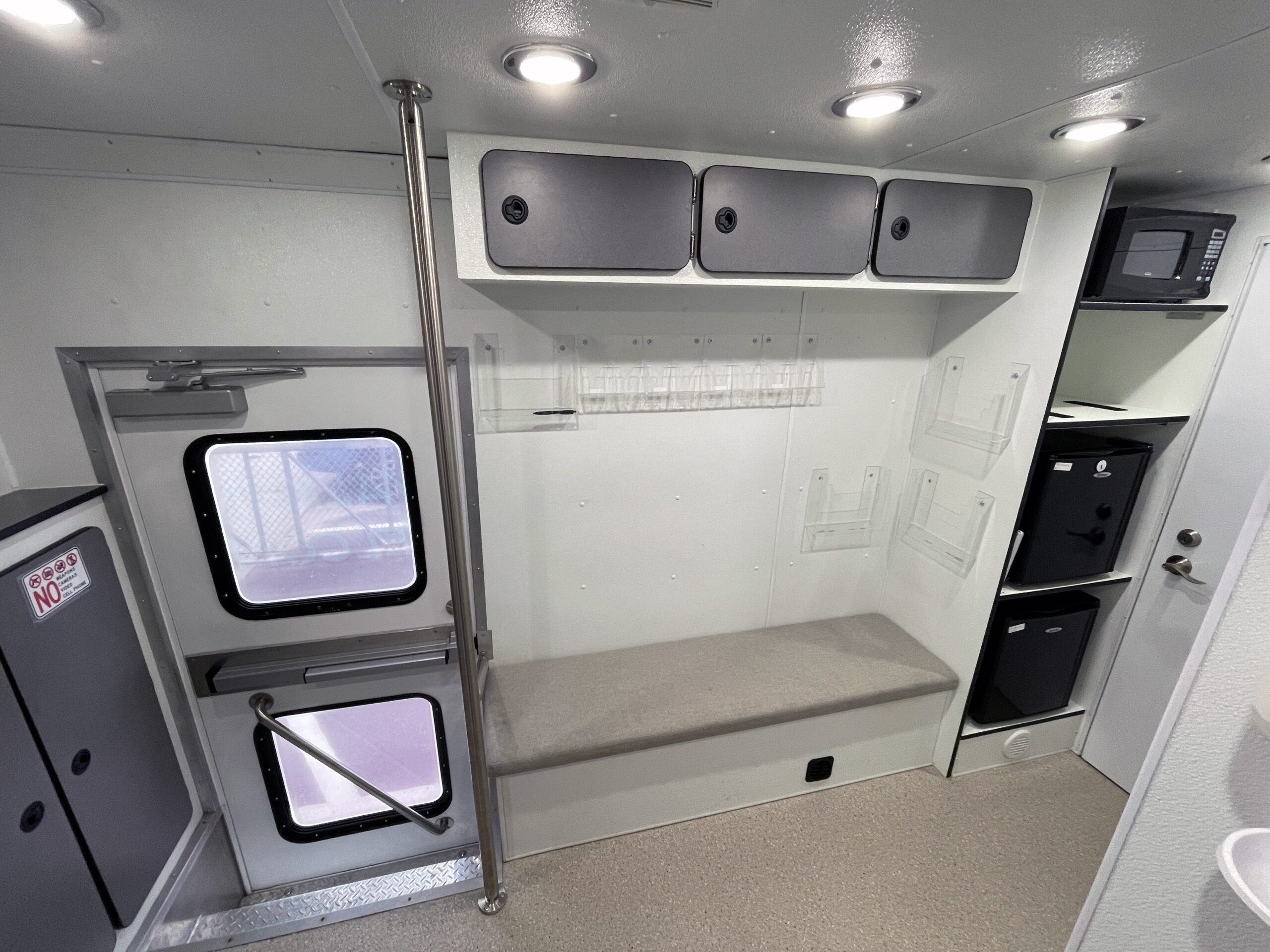 For sale is a 2018 Mobile Medical Clinic on a Chevy Express 4500 chassis with the only 3,084 miles! This unit is in excellent shape and still feels ‘Like New’ as it was not deployed daily. This unit has a check-in/waiting area and a separate exam room. The unit is equipped with a Cummins Onan 7 Kw Commercial Generator with 345 hours and 30 Amp Shore Power access w/ cord. The front waiting area includes bench seating throughout, a Coleman Mach Rooftop A/C Unit, 120 Volt AC system, 12 Volt DC System, ISeries tank systems monitor for fresh and waste water tanks, Upper and Lower custom laminate locking cabinetry, sink/sanitation, workstation, (4) GFI outlets, (2) Costway convenience refrigerator, Airxcel carbon monoxide alarm, Rival microwave, and bathroom with a sink and specimen pass through. The back exam room has its own privacy locking door, Ritter 104 exam bed, ASUS TV Monitor, (2) GFI outlets, and trash can. This unit has as LED lighting throughout the interior, a backup camera w/ 7in screen for monitoring, and 2 outer storage compartments. For more information, please contact Ben at 419-708-3112.
