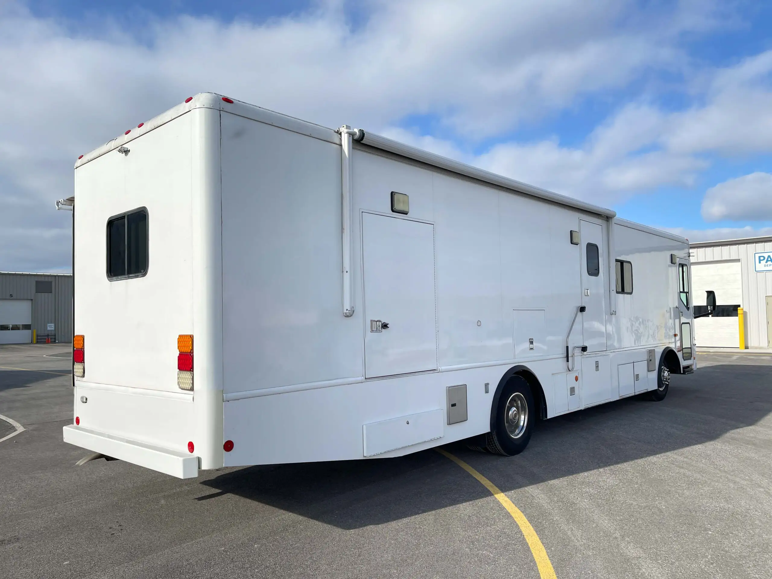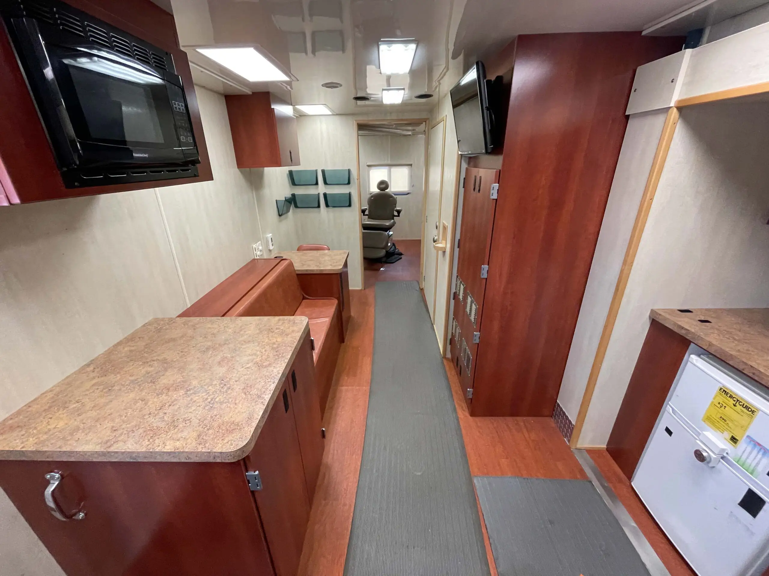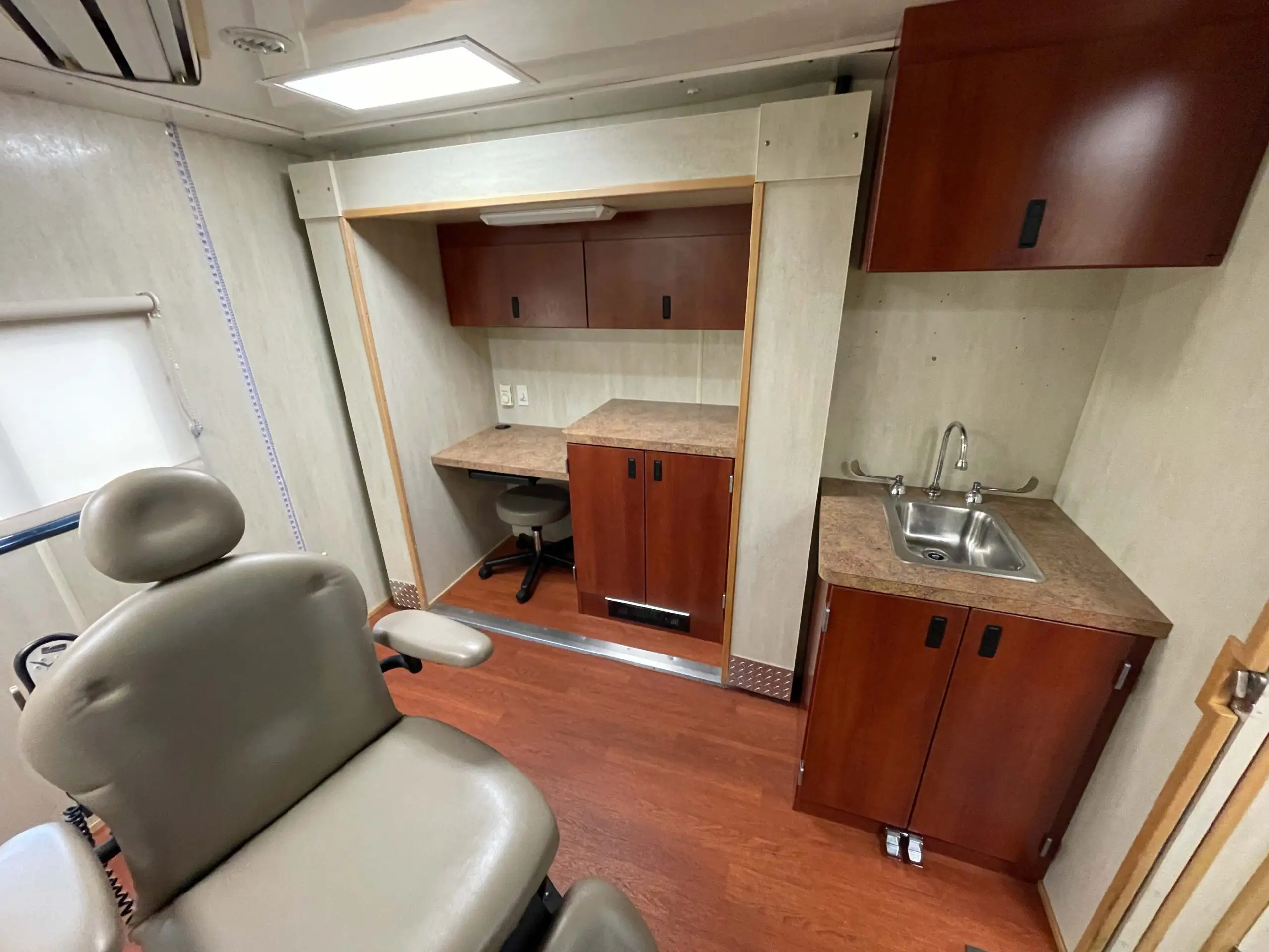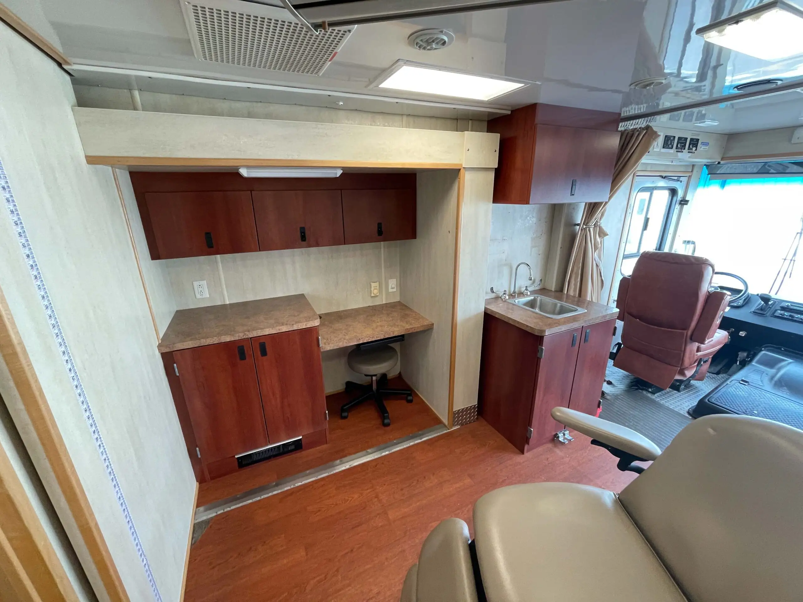 For sale is a 2015 Thomas Built mobile clinic, CDL required. This unit features two separate exam areas, each with privacy doors, as well as a waiting area. The front exam room is equipped with a Midmark 641 exam chair, a sink, rooftop air conditioning, a workstation, upper and lower locking cabinets, a trash can, a privacy curtain, and a Samsung TV monitor. The middle room offers two locking Summit medical fridge/freezers, a Franklin Chef microwave, a workstation, a waiting bench, upper and lower locking cabinets, a bathroom with a specimen pass-through and a rooftop power vent, a Prevent sharps disposable container, a networking cabinet, and a Samsung TV monitor. The rear exam room includes a Midmark 641 exam chair, a workstation, a sink, upper and lower locking cabinets, and a Samsung TV monitor. This mobile clinic is also equipped with a 20 kW Cummins generator, a Braun UVL wheelchair lift, a backup camera system, a Dometic power awning, and an outer TV monitor with an enclosure. For more information or to schedule a viewing, please contact Ben at 419-708-3112.